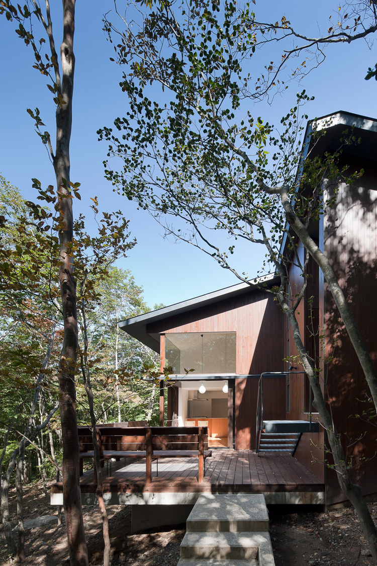 夫婦と小さな息子のための別荘である。日々の忙しさから離れ、リフレッシュするためのシンプルな小屋のような空間を望まれた。まず、等高線に沿って平行に2つのヴォリュームを配置し、そのヴォリュームを上下左右にずらした。それにより、森の間を縫うような平面と、地形の変化や木々をさまざまに感じることの出来る3つのレベル差を持った断面をつくり出している。ここでのテーマは森との連続感、自然との一体感である。プランのズレによって出来た部分は内部と連続したデッキとなっており、コーナーの開口を引き込むことで内外の境界が曖昧になる。外観も杉板張りの外壁やスリット窓の連続で森の風景になじむように配慮した。それらによって、建物が主役ではなく、空間や生活が森と共に感じられる開放感のある別荘となった。